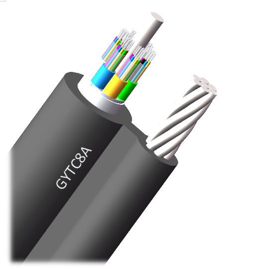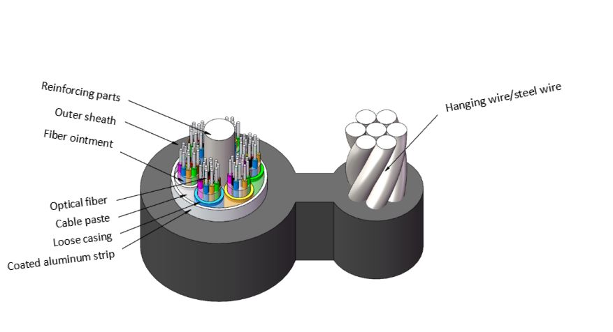 Struktur kabel optik adalah dengan memasukkan serat optik mode tunggal atau multi-mode ke dalam tabung longgar yang terbuat dari plastik modulus tinggi yang diisi dengan senyawa tahan air. Bagian tengah inti kabel adalah komponen penguat logam. Untuk beberapa kabel optik dengan jumlah inti tertentu, struktur kabel optik adalah dengan memasukkan serat optik mode tunggal atau multi-mode ke dalam tabung longgar yang terbuat dari plastik modulus tinggi yang diisi dengan senyawa tahan air. Lapisan bantalan polietilena diekstrusi dan dibungkus di sekitar bagian penguat pusat logam. Tabung longgar (dan tali pengisi) dipilin di sekitar bagian penguat pusat untuk membentuk inti kabel yang kompak dan bulat. Celah di dalam inti kabel diisi dengan senyawa penahan air. Selubung terikat aluminium-polietilena diekstrusi dan dibungkus di luar, dan gantungan untaian baja ditambahkan untuk membentuk kabel.
