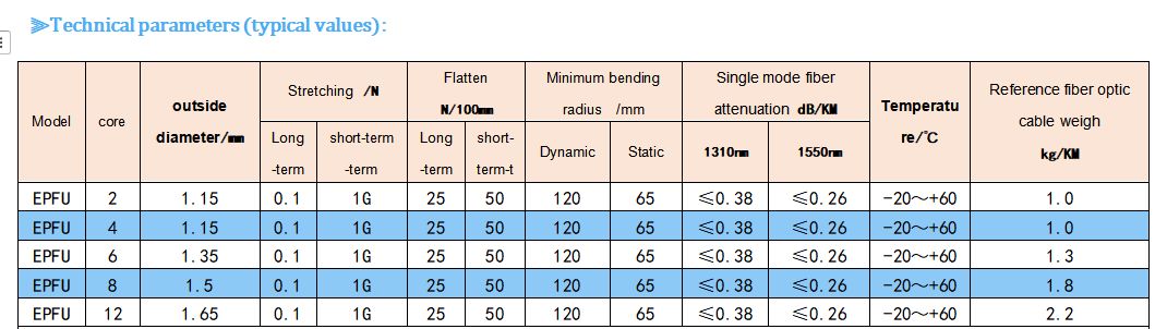 Struktur kabel terdiri dari serat mode tunggal atau multi-mode yang tersusun rapat (yang mungkin mengandung serat pengisi) membentuk konfigurasi reguler.bundel ditempatkan di tengah dan diekstrusi dengan lapisan polietilena kepadatan tinggi.